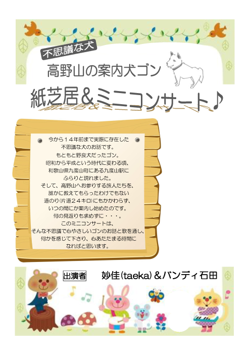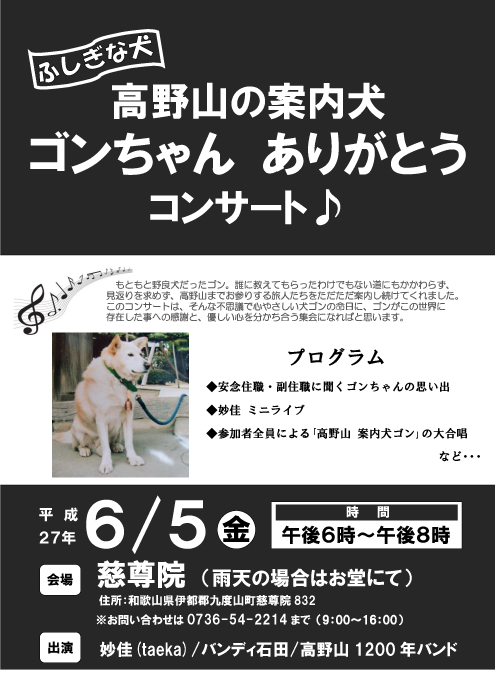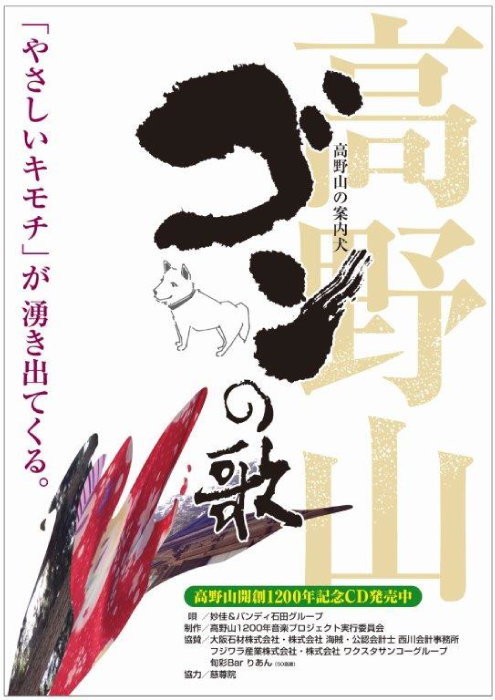 高野山へお参りする旅人たちを、険しい山道を案内し続けた犬・ゴン。ゴンの優しい心、見返りを求めず 誰かを励まし、誰かを喜ばせ、誰かをほっとさせる、ゴンの生き方。そんな心温まる「高野山の案内犬ゴンの歌」の楽曲企画・発売。